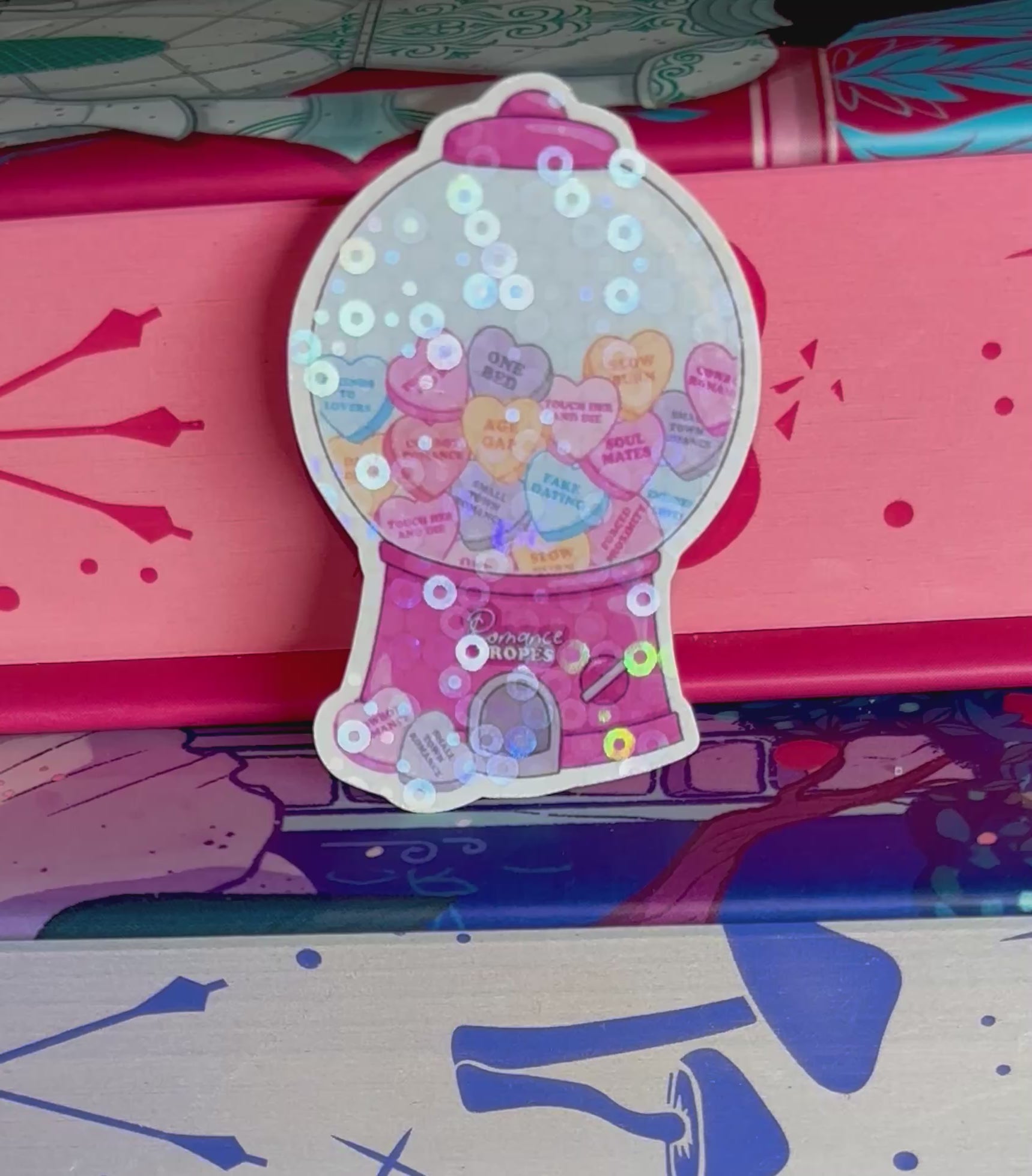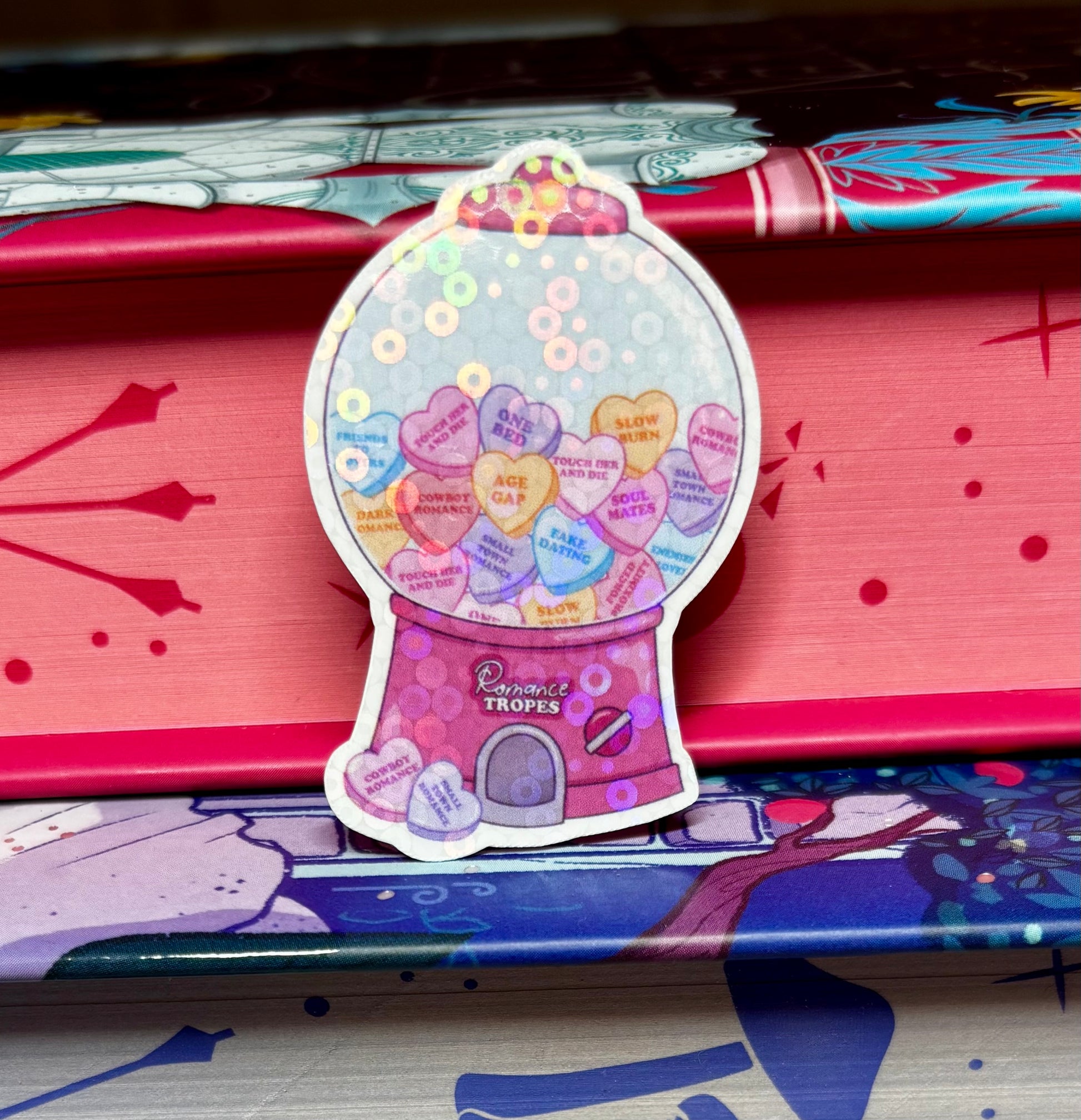 This Cute Love Heart Romance Tropes Vending Gumball Machine mini Sticker is full of your favourite romance book tropes.
