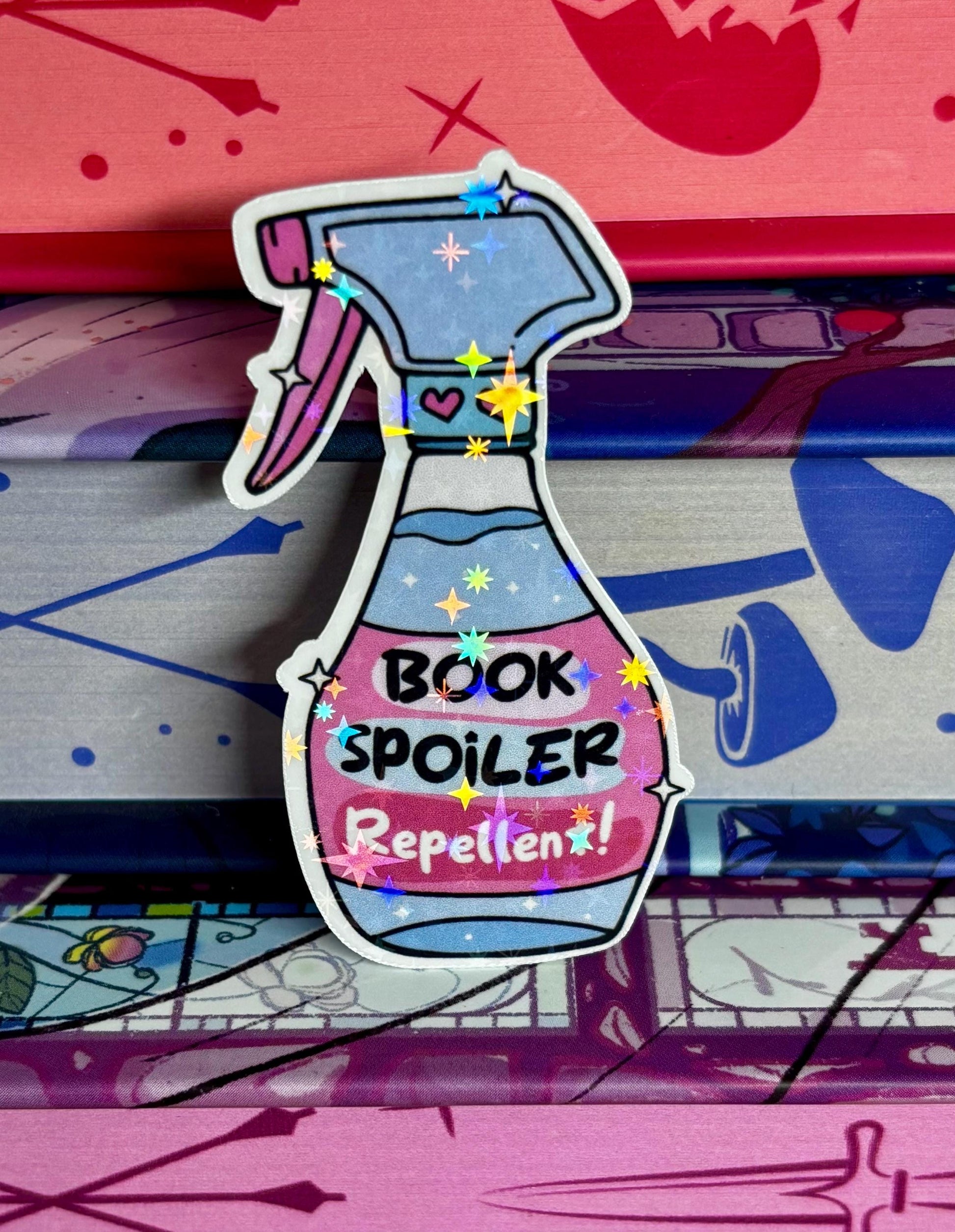 Mini book spoiler repellent holographic laminate bookish sticker, die cut, bookish stickers, readers gifts, sparkly stickers, e-reader